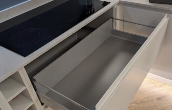 If the oven is relocated to a tall unit, it removes the need to bend down during cooking. More importantly, it allows you to maximise the space directly beneath your hob with wide, shallow drawers—perfect for storing cooking utensils and pans where they are most needed.