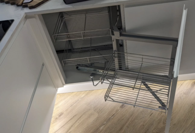 To avoid the inconvenience of reaching into deep cupboards, we recommend high-quality pull-out mechanisms. These units are not limited to corner cupboards; they are exceptionally helpful when used in tall larders or under-counter storage, bringing the contents of the cabinet directly to you.