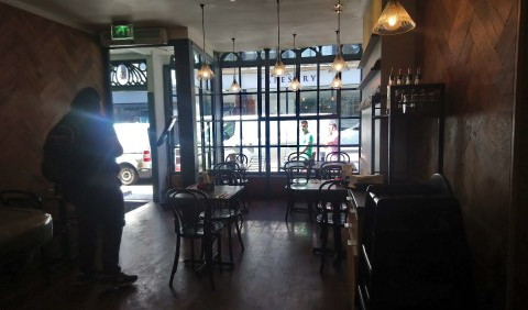 The cast iron pillars from the Gothic shopfront provide order to it and the grid within the widest bay and former shopfront is created by wooden dividers and interrupted by two openable windows which can be slide sideways.